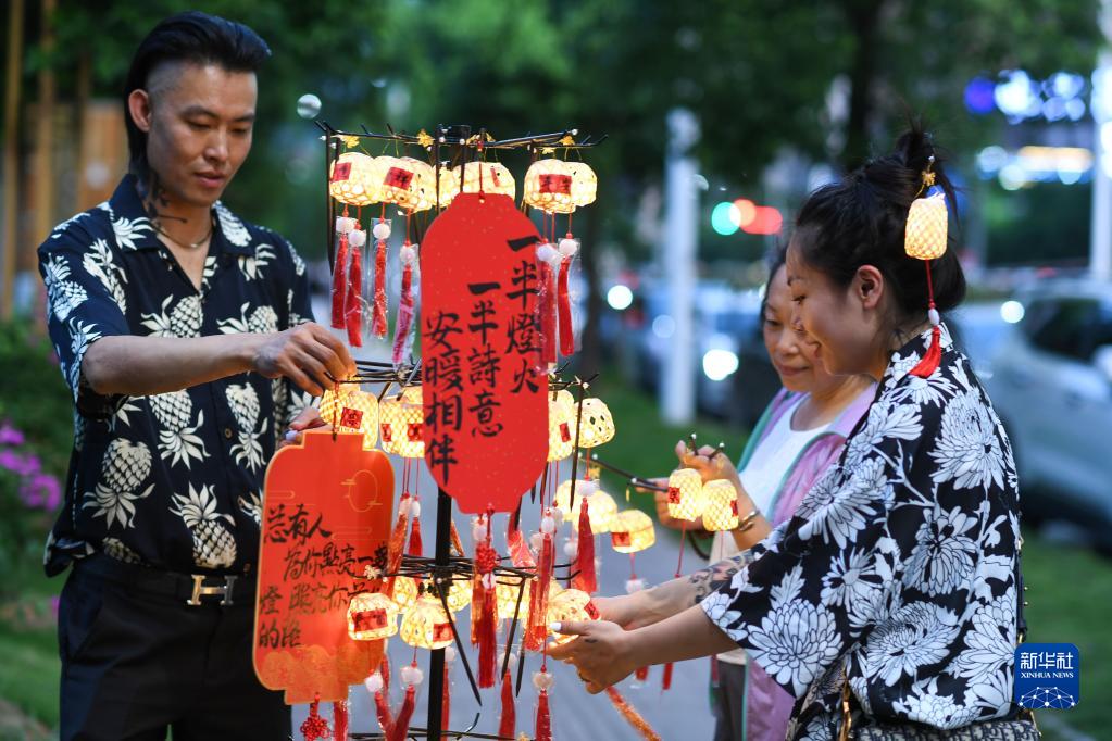 6月30日,村民在貴州“村超”足球賽場附近整理售賣的小燈籠。