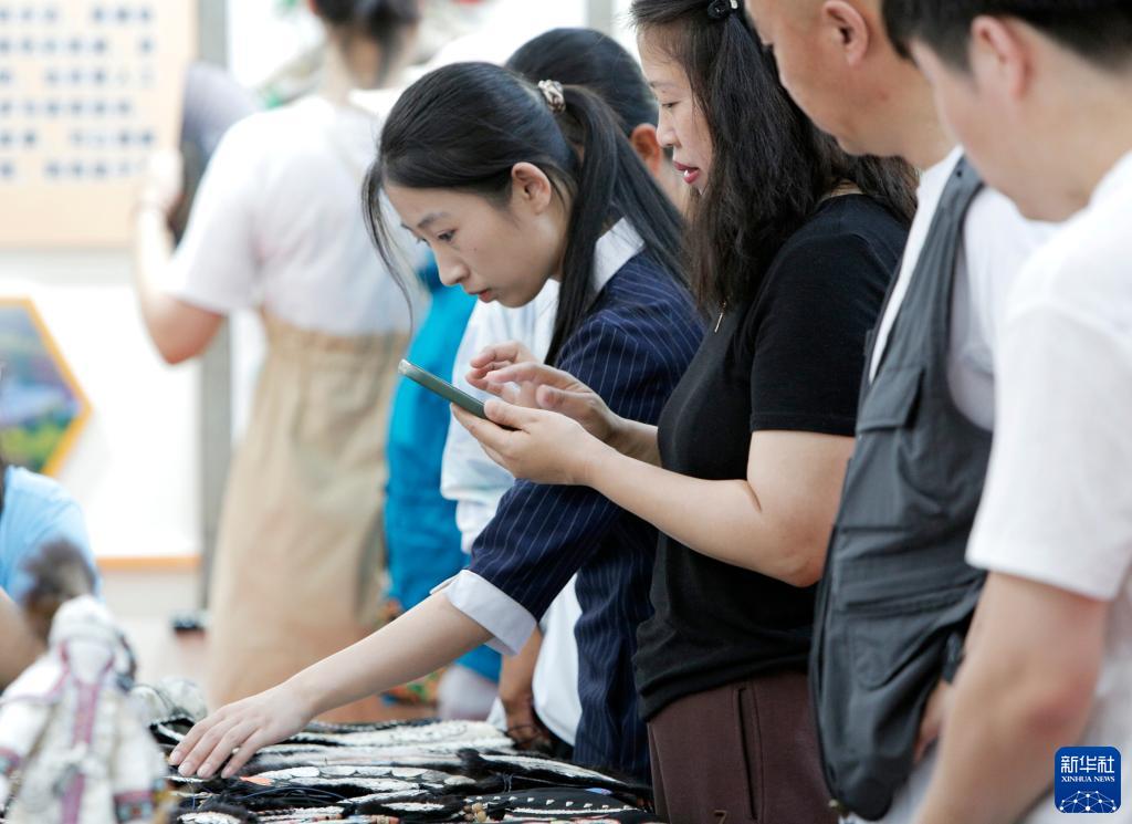 7月2日,游客在第十一屆赫哲族烏日貢大會的赫哲族歷史文化長廊查看魚皮掛件。