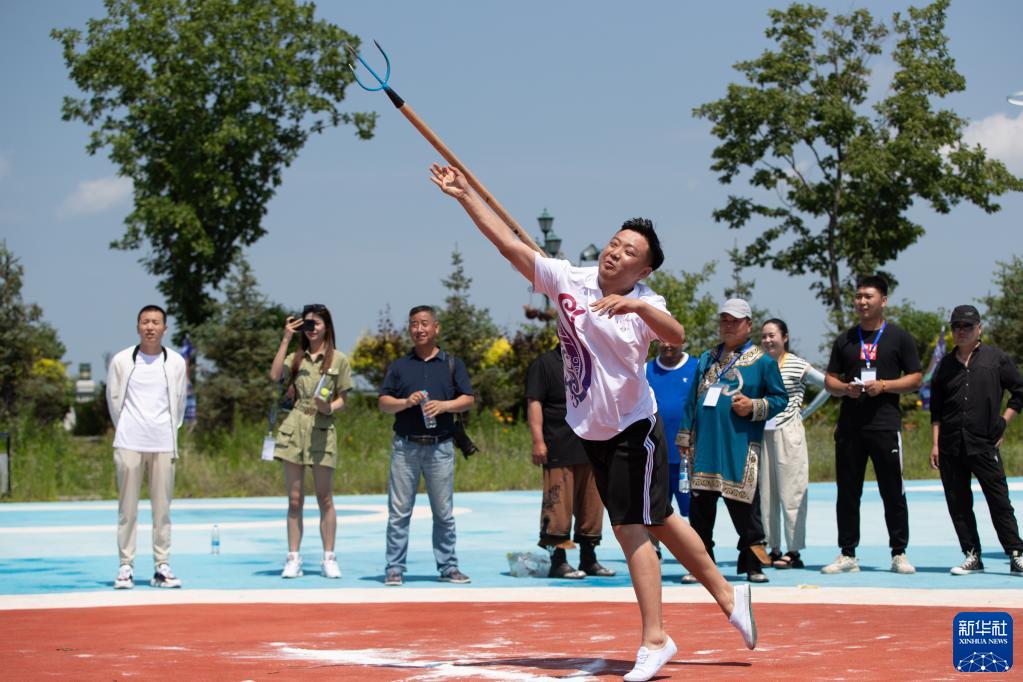 7月2日,在第十一屆赫哲族烏日貢大會現場,赫哲族選手參加叉魚比賽。