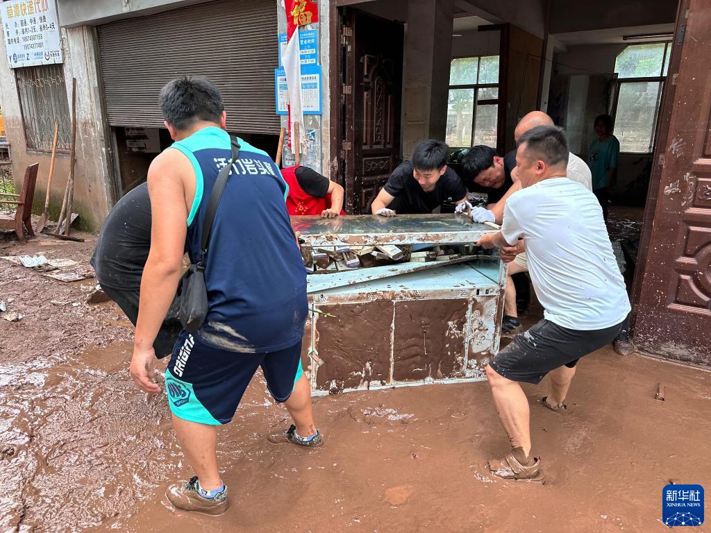 7月2日,在湖南省湘西土家族苗族自治州古丈縣巖頭寨鎮草潭村,志愿者協助村民清理家中受損家具。