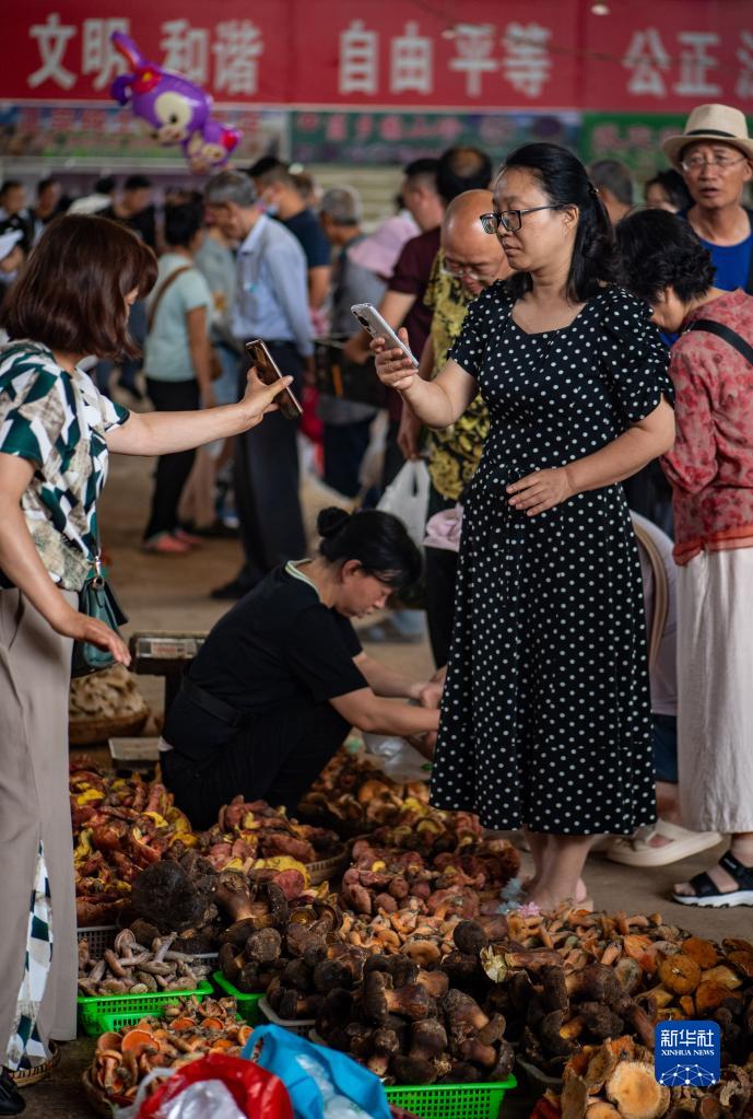 7月2日,市民在位于昆明市的一處野生菌交易市場購買野生菌。