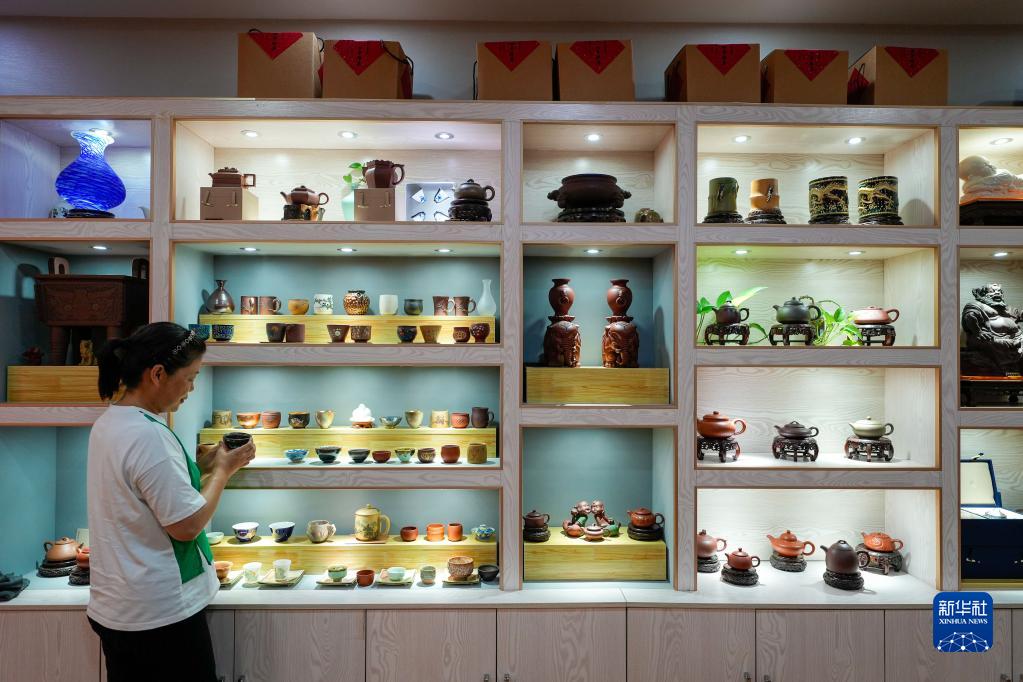 啟新1889文化創意產業園一家商鋪的工作人員在整理文創產品(7月2日攝)。