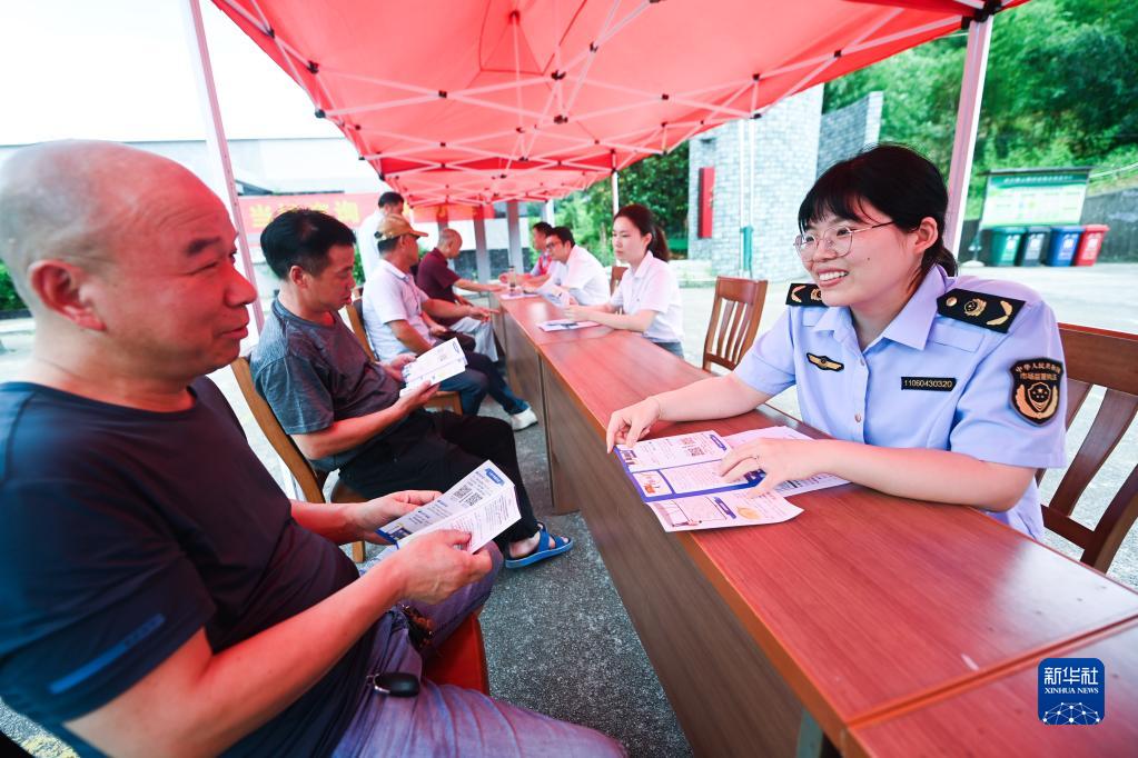 7月3日,諸暨市店口鎮便民服務中心在上畈村開展政務服務進村入社“流動服務”活動,市場監管局工作人員(右一)在進行個體工商戶年報申報問題的解答。