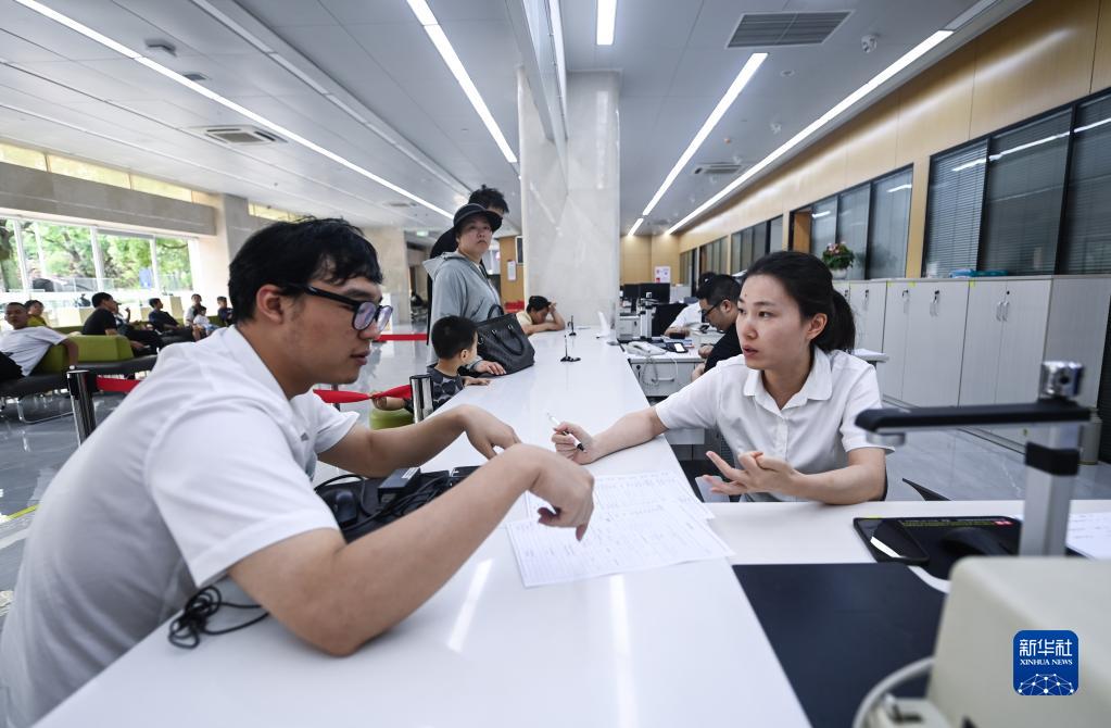 7月3日,在諸暨市店口鎮便民服務中心內,企業負責人(左)在辦理立項審批業務。