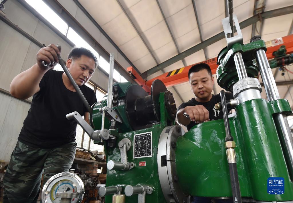 7月3日,工人在河北省晉州市營里鎮一家地質裝備企業生產車間工作。