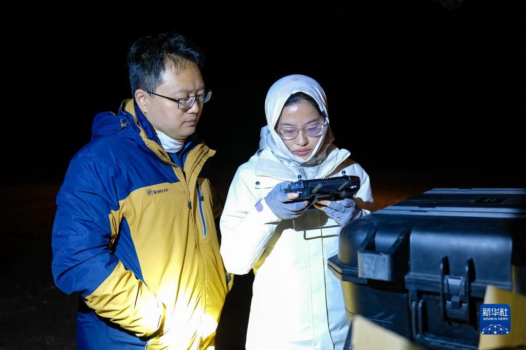 6月16日凌晨,連新明(左)和學生王子涵在青藏公路楚瑪爾河大橋附近,使用無人機監測藏羚羊遷徙途中的夜宿地。