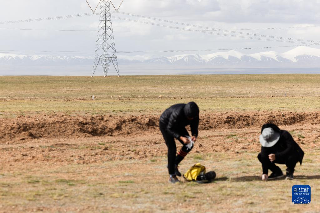 6月15日,中國科學院西北高原生物研究所研究員連新明(右)和他的學生王東在可可西里采集藏羚羊新鮮糞便樣本。