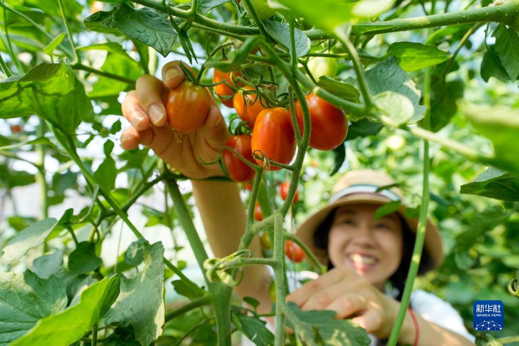 7月3日,市民在河北省唐山市路北區一處家庭農場內采摘櫻桃西紅柿。