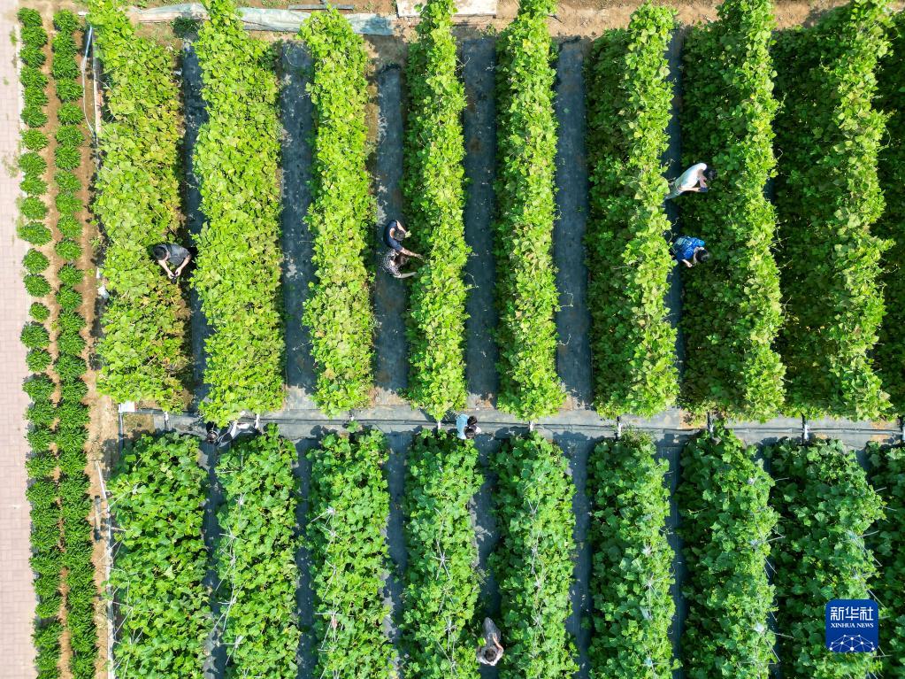 7月3日,市民在河北省唐山市路北區一處家庭農場內采摘(無人機照片)。