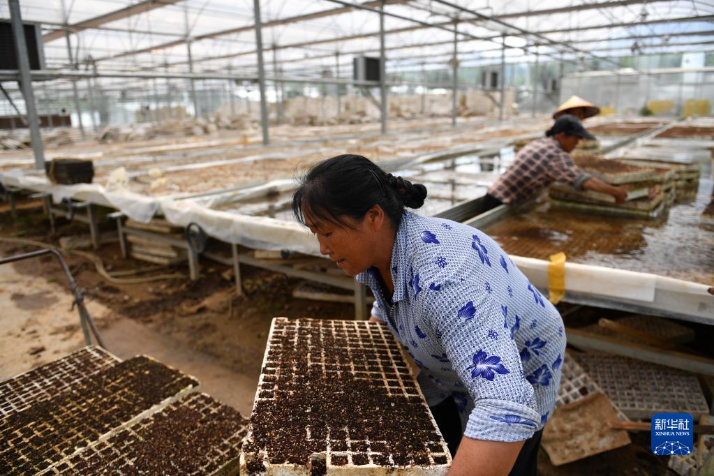 7月3日,在湖南湘西州保靖縣陽朝鄉溪洲村一處農業基地,農民轉移蔬菜苗。