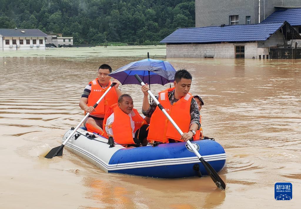 6月30日,在保靖縣陽朝鄉猛科村,當地應急民兵利用皮劃艇轉移被困村民。