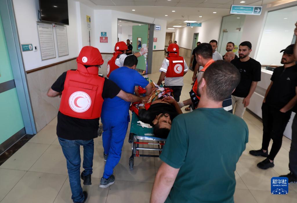 7月3日,在約旦河西岸杰寧地區,醫務人員將傷者送往醫院。
