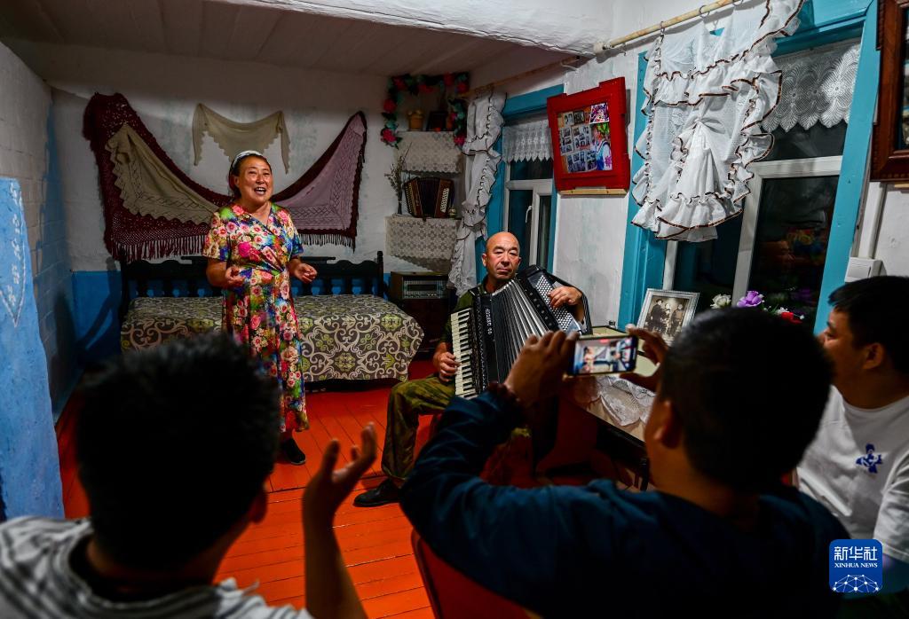 6月28日,考占花(左)為游客們唱歌,薩沙在拉手風琴??颊蓟ㄊ撬_沙的嫂子。