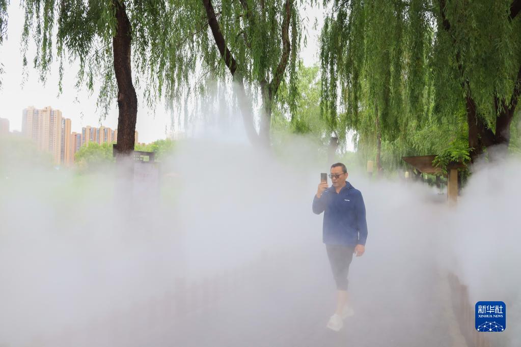 7月3日,在甘肅省蘭州市安寧區,市民在銀灘濕地公園散步。