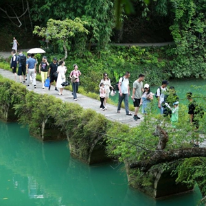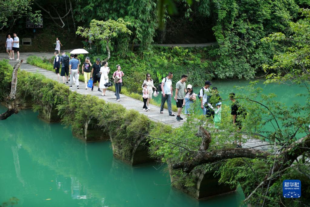 進入夏季,眾多游客來到貴州省黔南布依族苗族自治州荔波縣,暢游青山綠水,感受世界自然遺產地之美,樂享夏日時光。