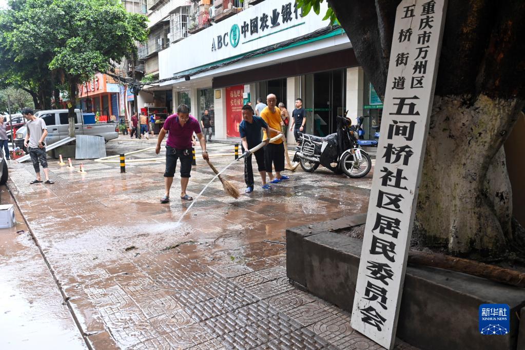 7月4日,重慶萬州區五橋街道,當地干部和群眾在積水退去后對街道進行清理。