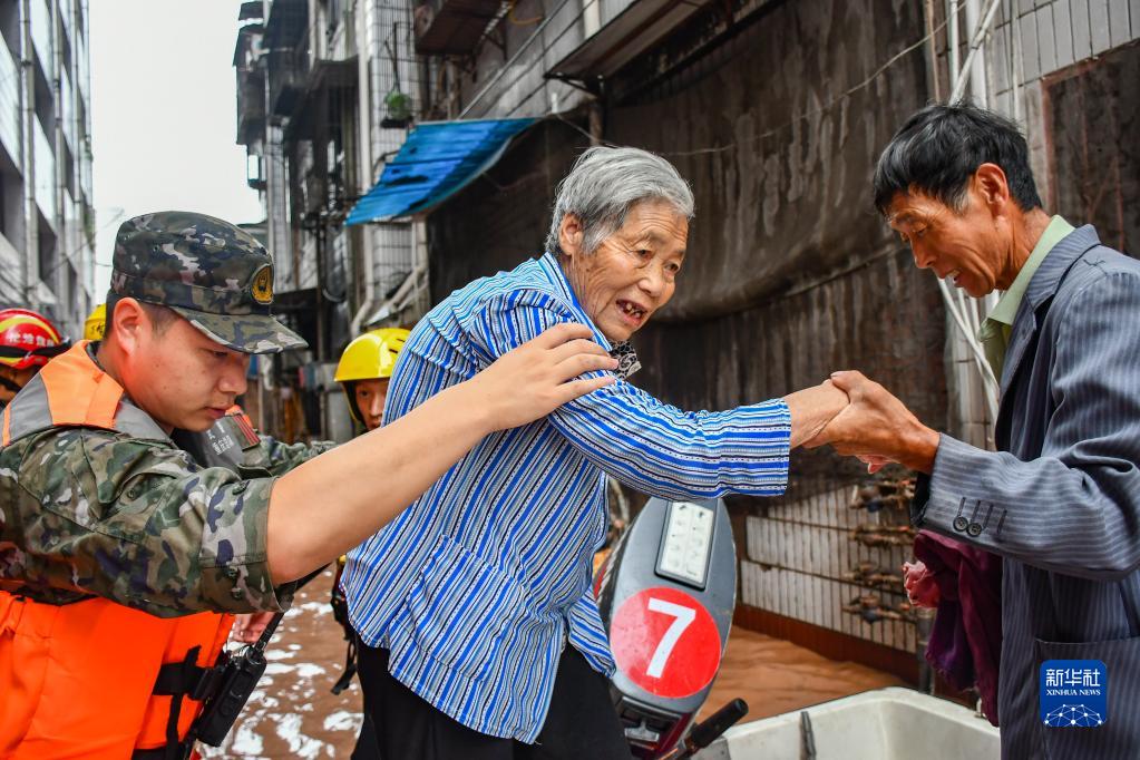 7月4日,在重慶市萬州區五橋街道,武警重慶總隊船艇支隊官兵在轉移受困群眾。