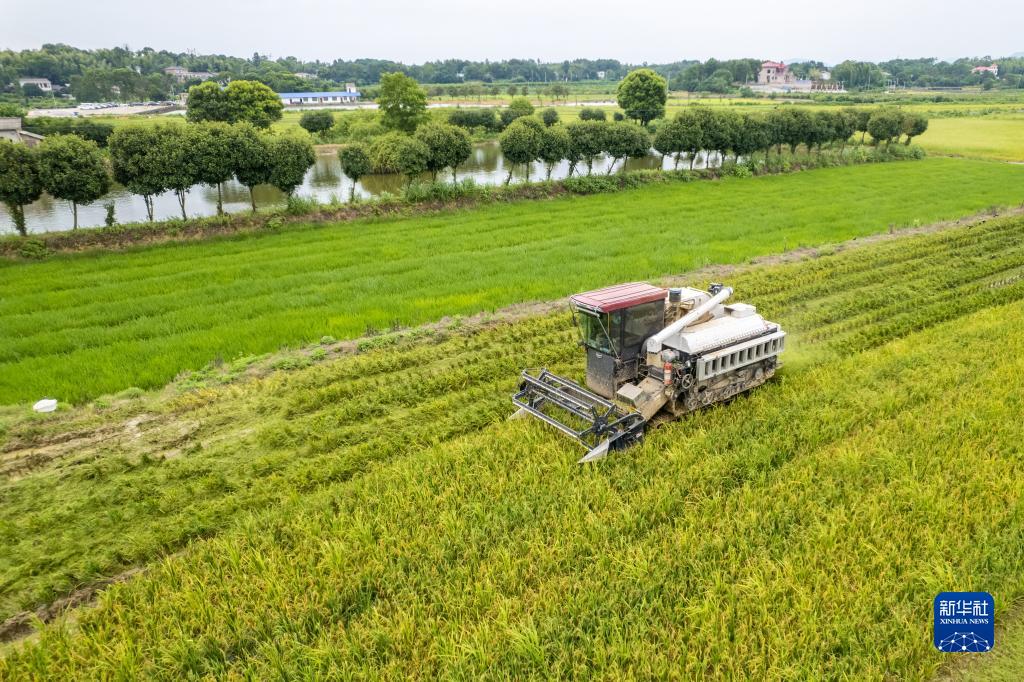 7月4日,在長沙市望城區茶亭鎮蘇蓼村,收割機在收割早稻(無人機照片)。