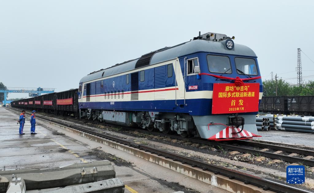 7月4日,首趟廊坊“中吉烏”國際多式聯運班列駛出廊坊北鐵路貨場。