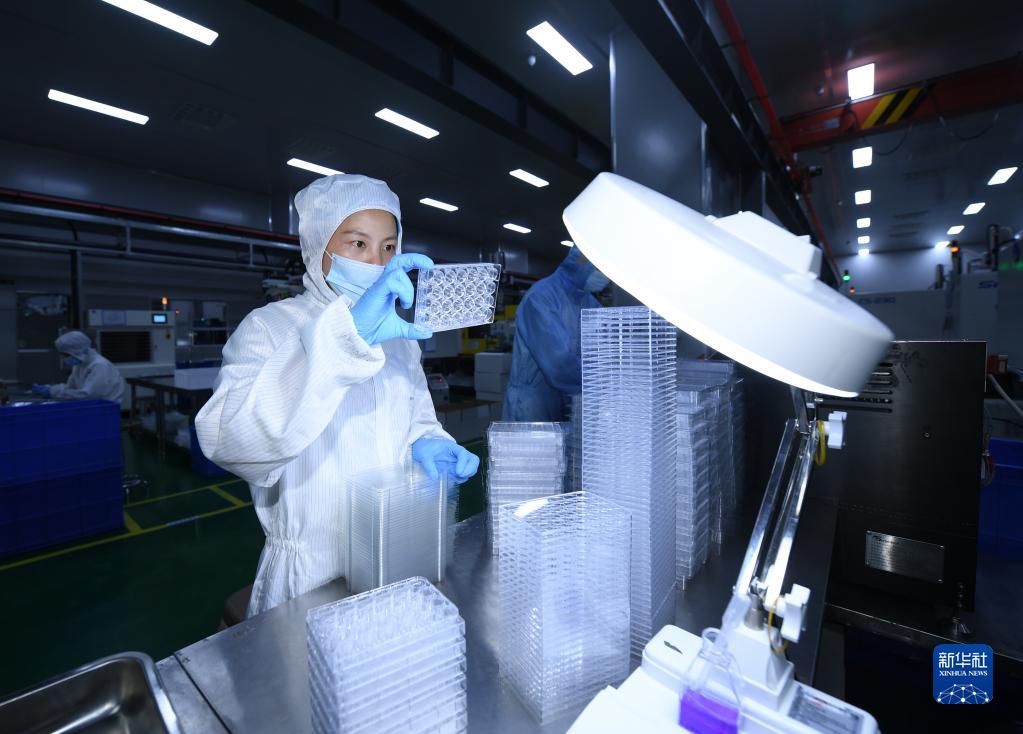 7月4日,在位于仙居縣的浙江賽寧生物科技有限公司,工作人員在生產線上檢查一款醫療產品。