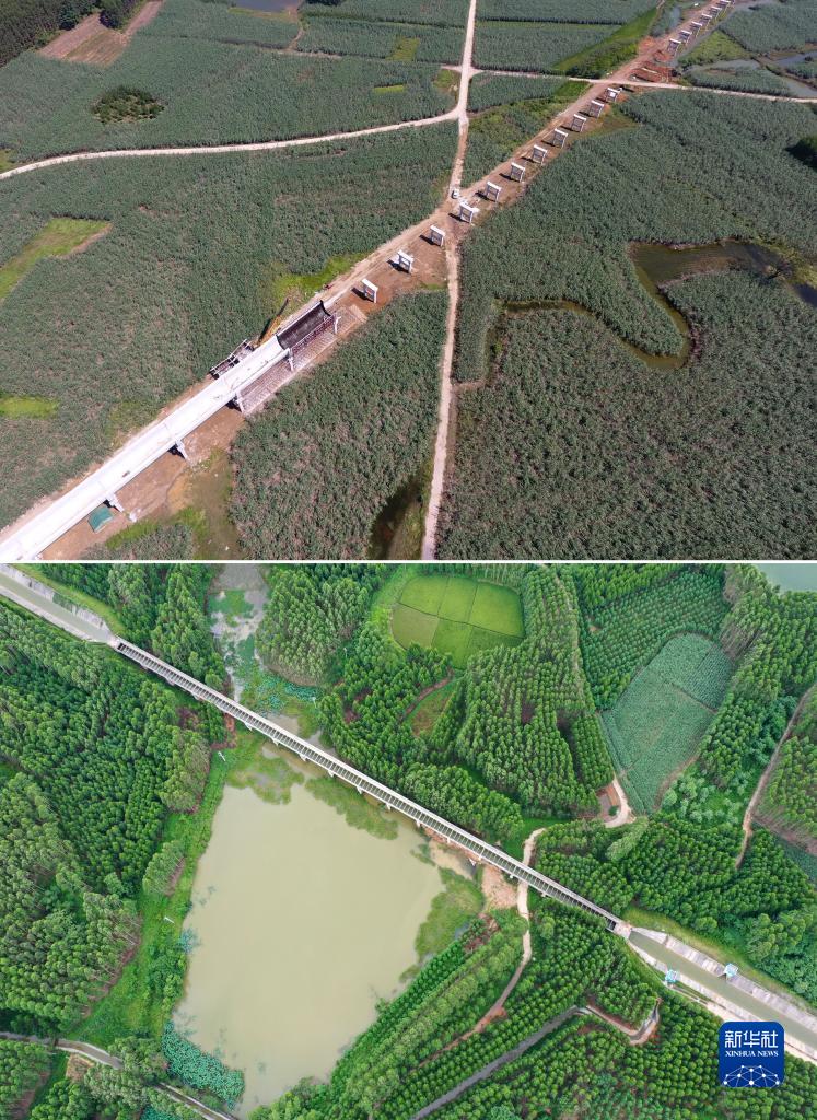 拼版照片:上圖為在廣西來賓市興賓區遷江鎮拍攝的正在施工建設中的“桂中治旱”工程一處引水渡槽(無人機照片,2018年9月21日攝);下圖為在廣西來賓市興賓區遷江鎮拍攝的已經建成通水的“桂中治旱”工程一處引水渡槽(無人機照片,2023年7月4日攝)。