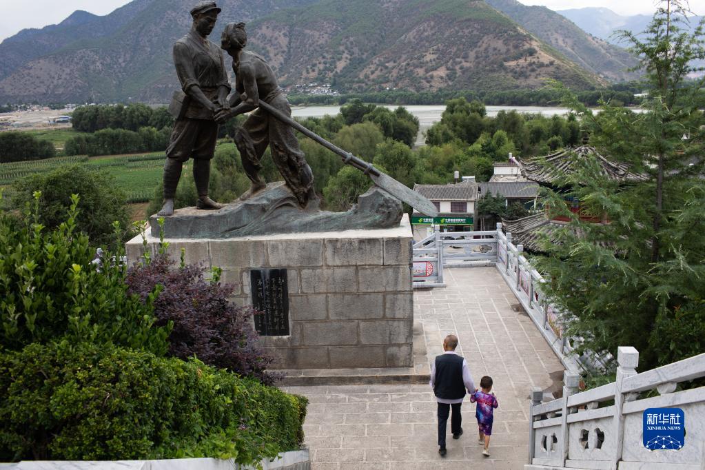 6月20日,在位于麗江市石鼓鎮的紅軍長征過麗江紀念館,66歲的退伍軍人王自榮帶著孫子走過“金沙水暖”雕塑。