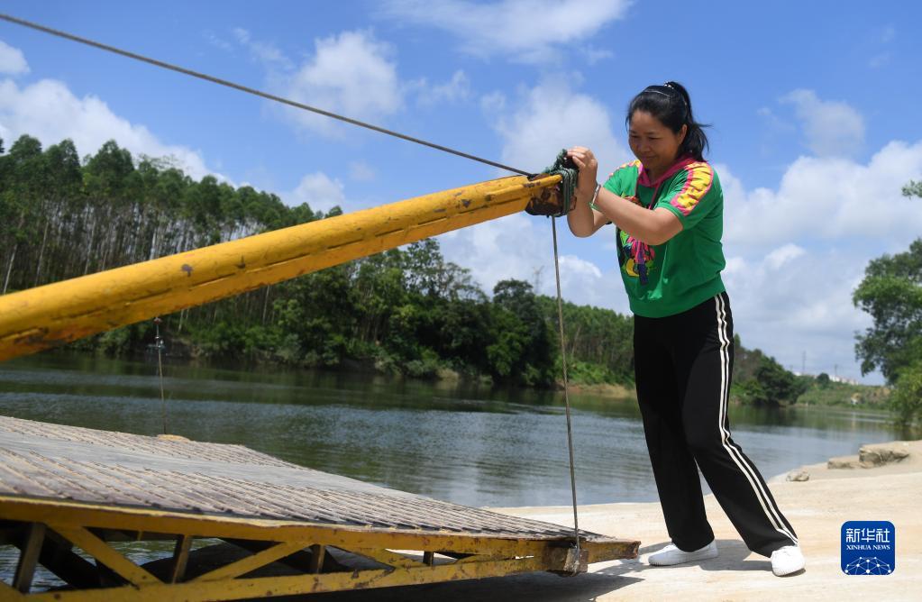 7月4日,在廣西來賓市興賓區遷江鎮大力村清水河上,李曼榮在操作渡船。