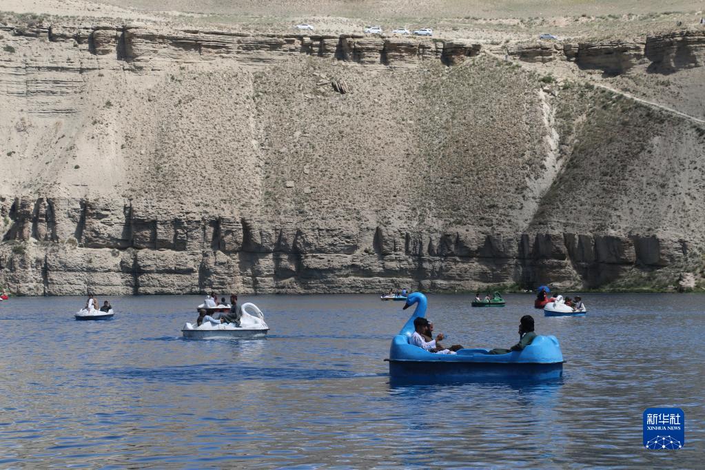 7月3日,游客在阿富汗巴米揚省班達米爾國家公園內的班達米爾湖上泛舟游玩。