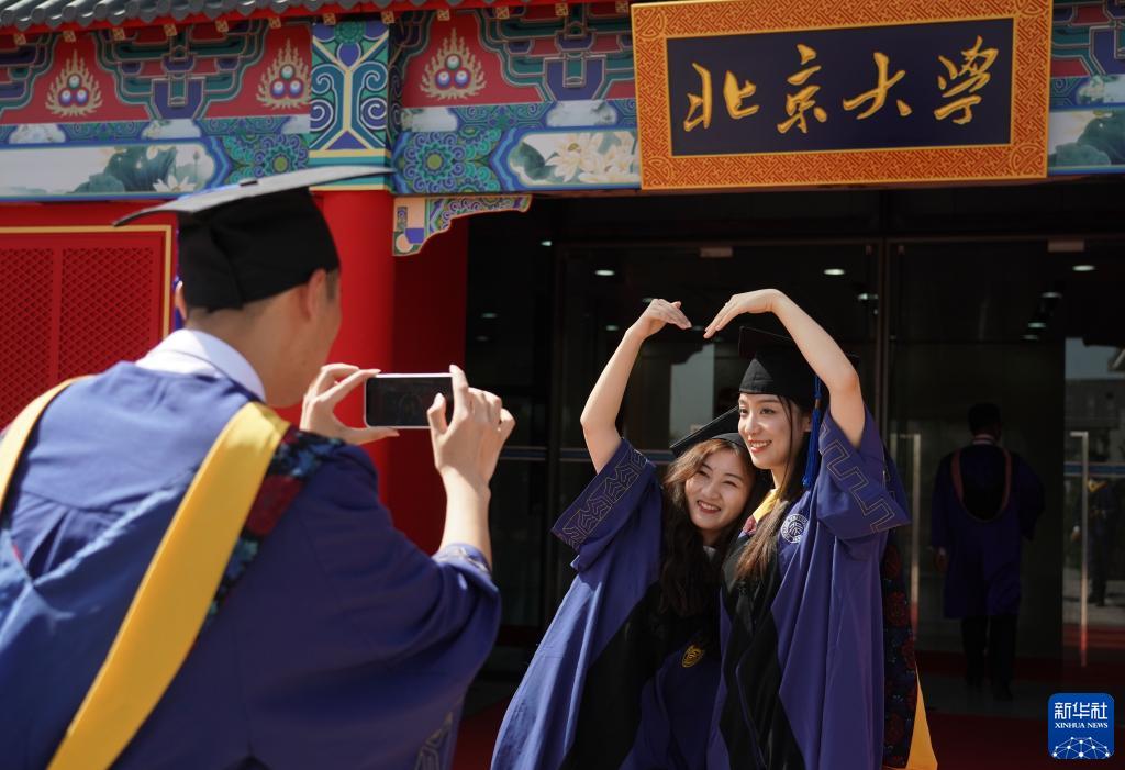 7月5日,畢業生在北京大學2023年研究生畢業典禮暨學位授予儀式結束后拍照留念。