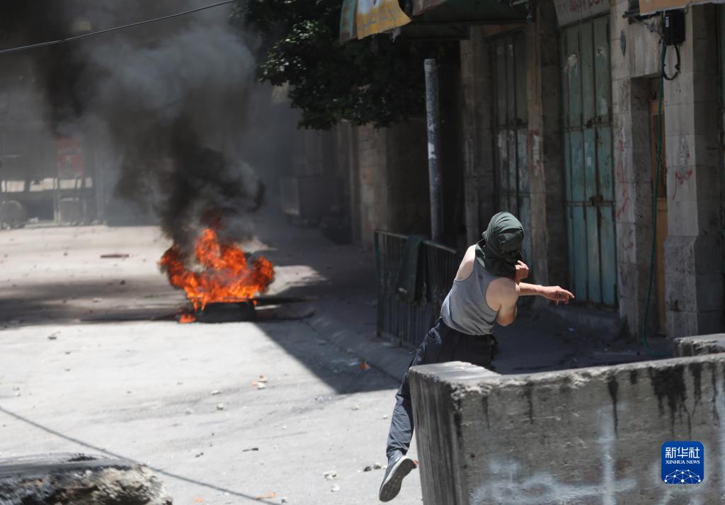 7月4日,在約旦河西岸城市希伯倫,巴勒斯坦抗議者在沖突中投擲石塊。