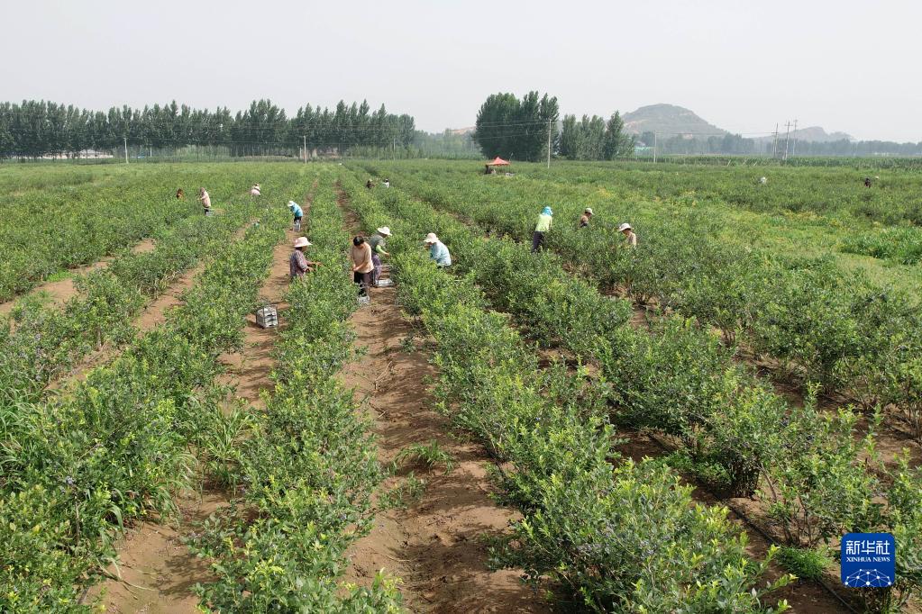 7月5日,河北省灤州市東安各莊鎮三山院村的農民在田間采摘藍莓(無人機照片)。