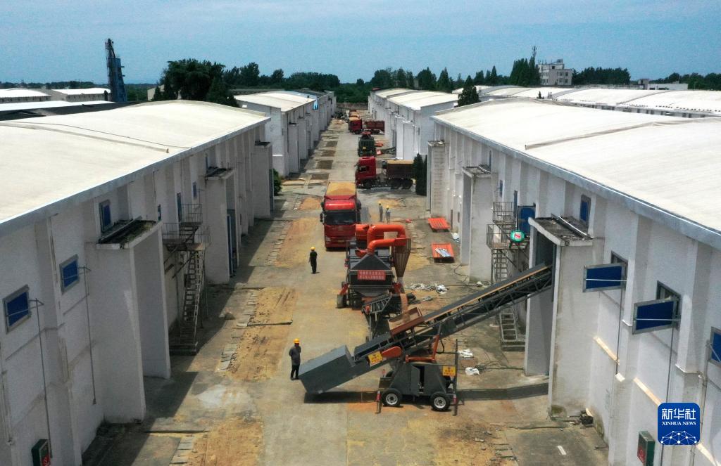 7月4日,河南鄧州國家糧食儲備庫的工作人員在進行卸糧入庫作業(無人機照片)。