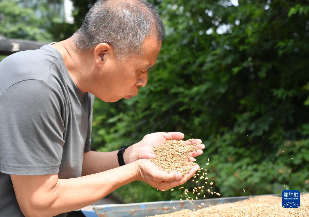 7月5日,河南唐河國家糧食儲備庫的工作人員在對小麥進行初步檢查。