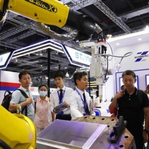 7月5日,參觀者在一臺進行作業演示的機器人激光焊接機前駐足觀看。