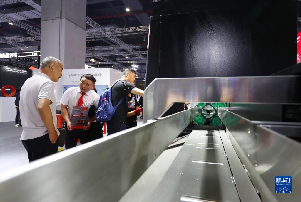 7月5日,參觀者在一臺光纖激光切管機旁與工作人員交流討論。