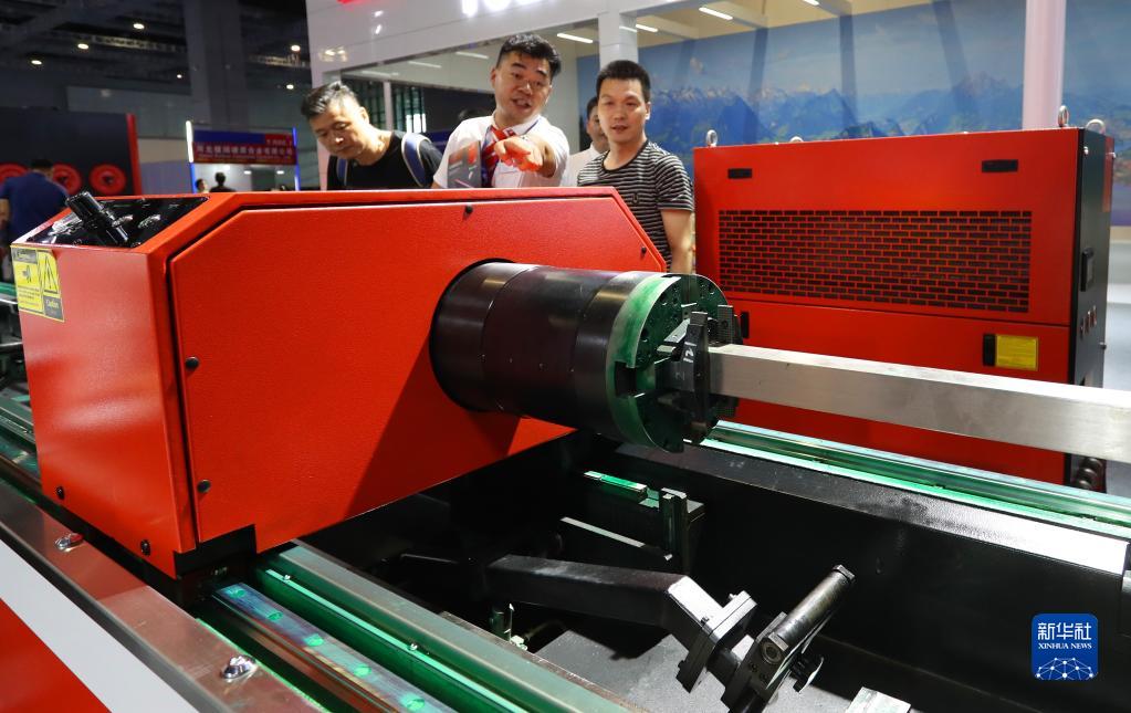 7月5日,展方工作人員(中)向參觀者介紹一臺光纖激光切管機。