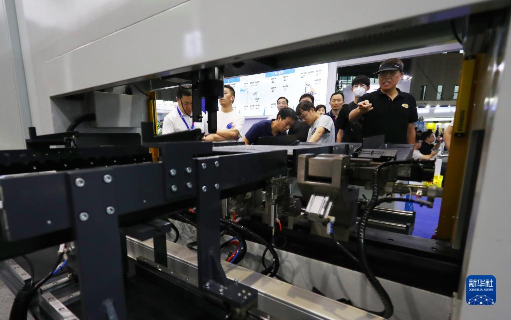 7月5日,參觀者在一臺全自動校直機前交流討論。