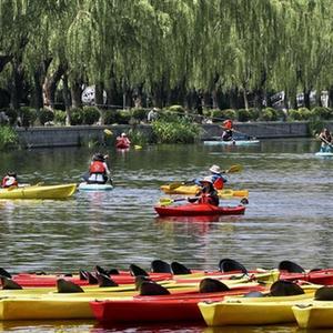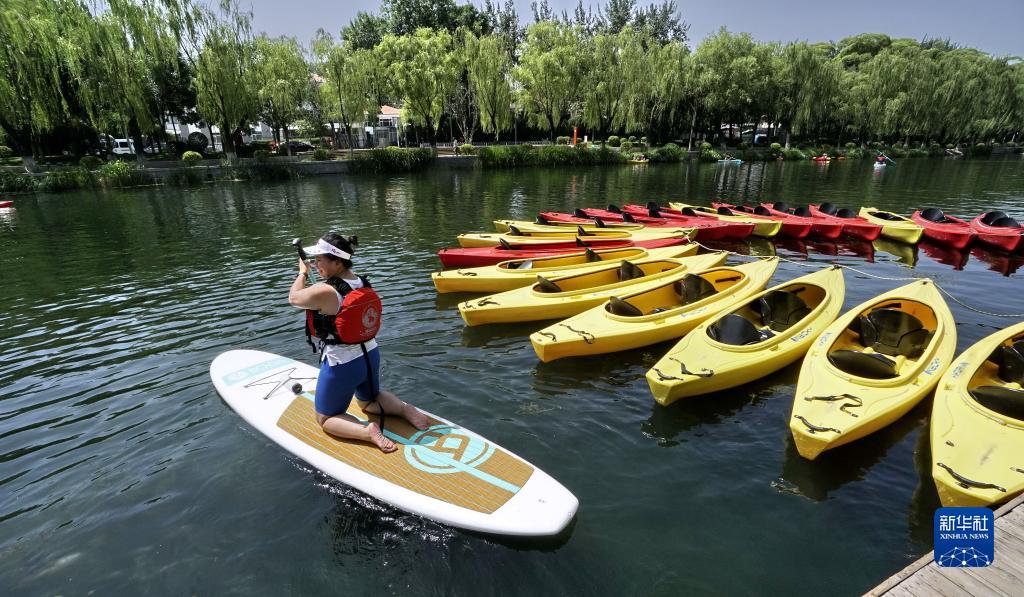 7月5日,市民在亮馬河上參加水上運動。