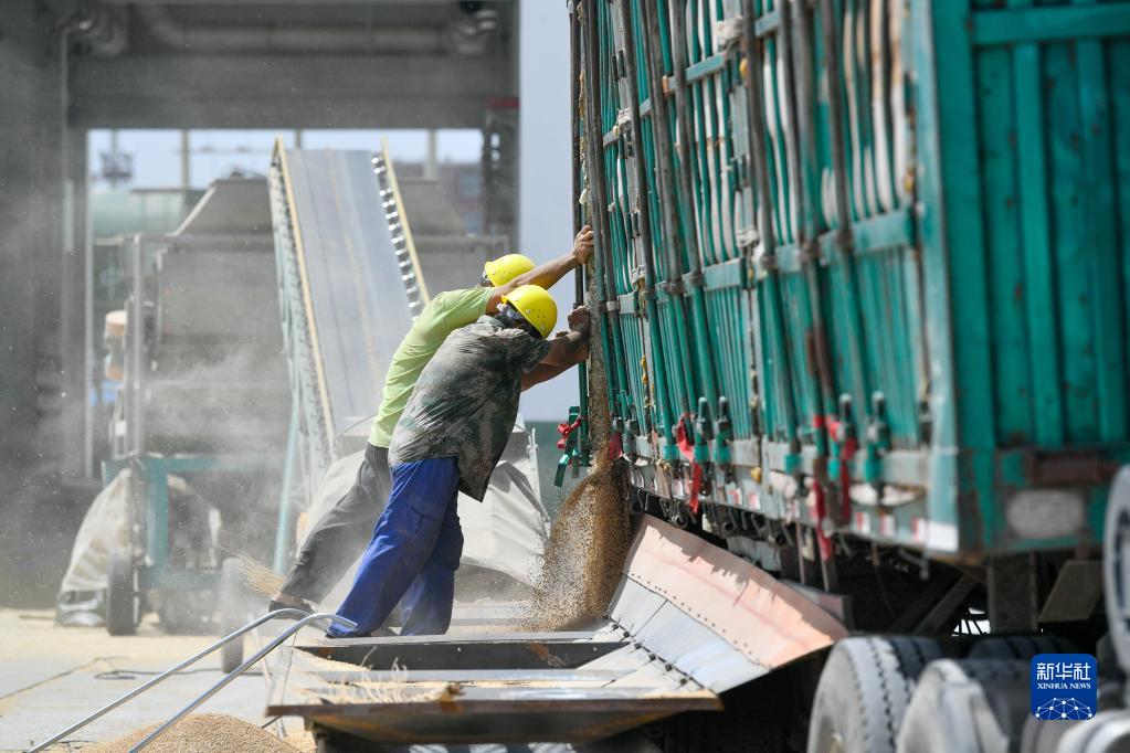 7月5日,在中央儲備糧天津東麗直屬庫有限公司大港分公司,工作人員在進行卸糧作業。