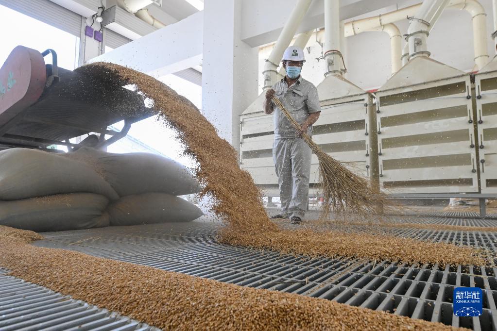 7月5日,在中央儲備糧天津東麗直屬庫有限公司大港分公司,工作人員在轉運小麥。