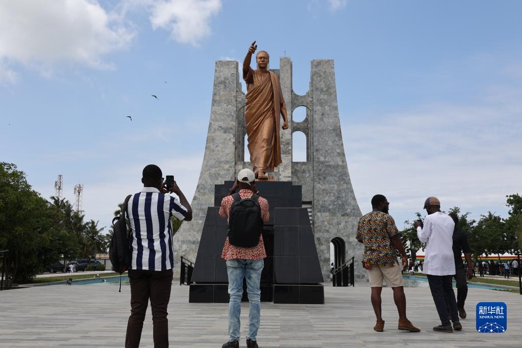 7月4日,游人在位于加納首都阿克拉的恩克魯瑪陵園內的恩克魯瑪塑像前拍照。