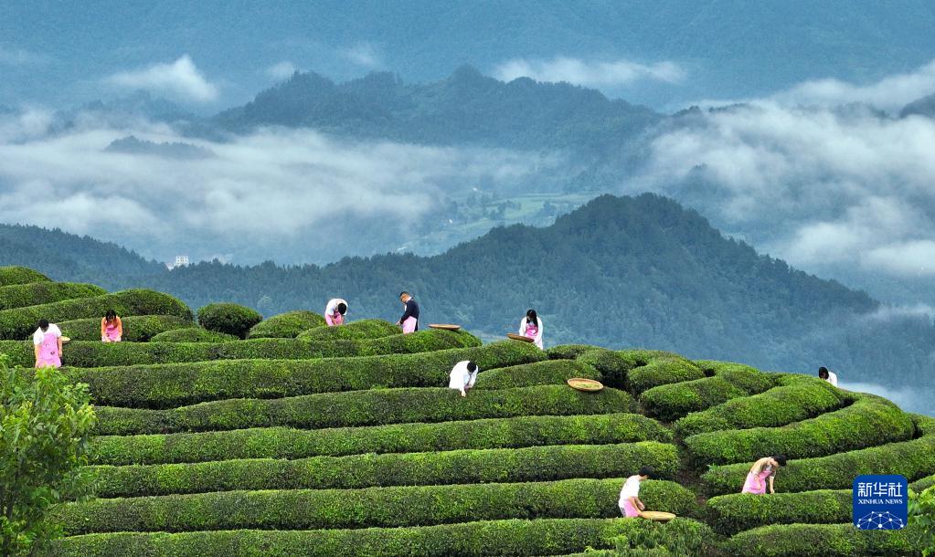 7月5日,茶農在貴州省岑鞏縣客樓鎮下寨村茶山采摘云霧茶(無人機照片)。