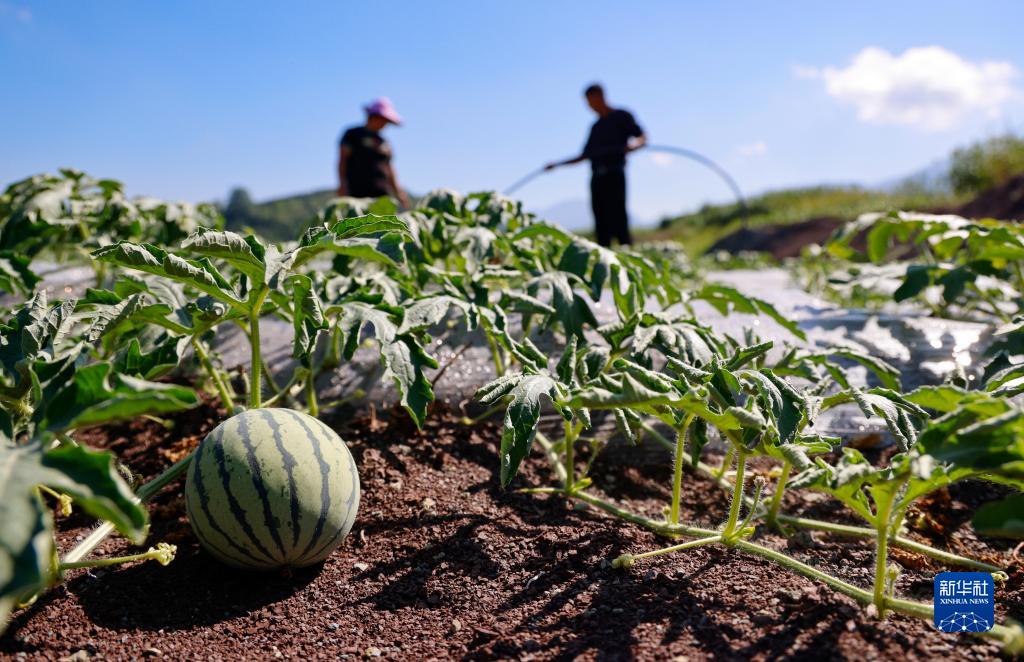 7月5日,農民在貴州省遵義市正安縣安場鎮給西瓜澆水。