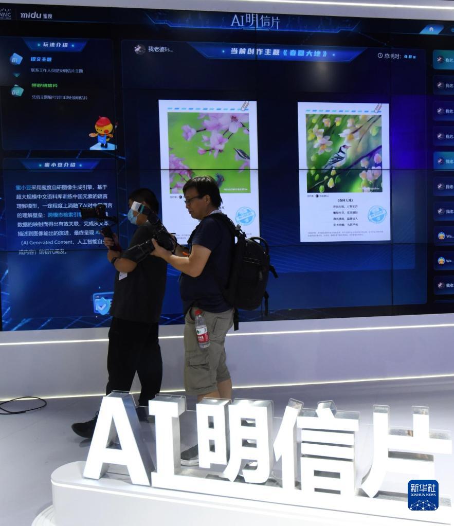 7月5日,兩名記者在一家廠商展位拍攝“AI明信片”。