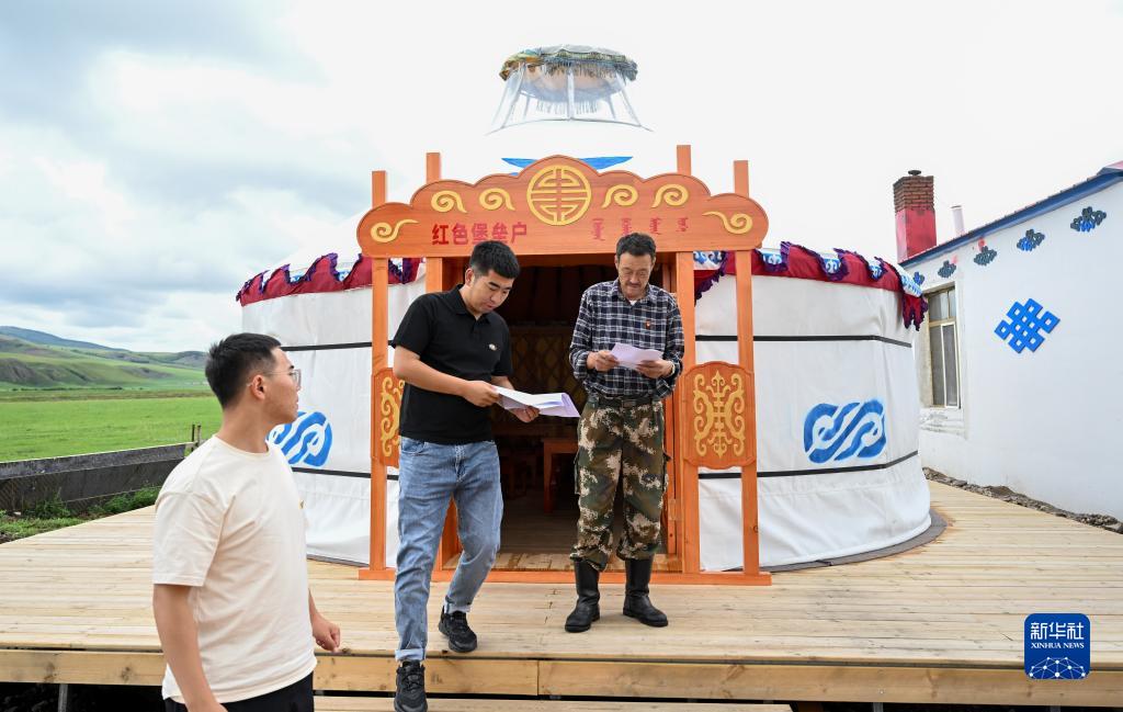 7月5日,在內蒙古興安盟科爾沁右翼前旗滿族屯滿族鄉,邊境服務站工作人員來到一名牧民(右)家中介紹防汛防災措施。