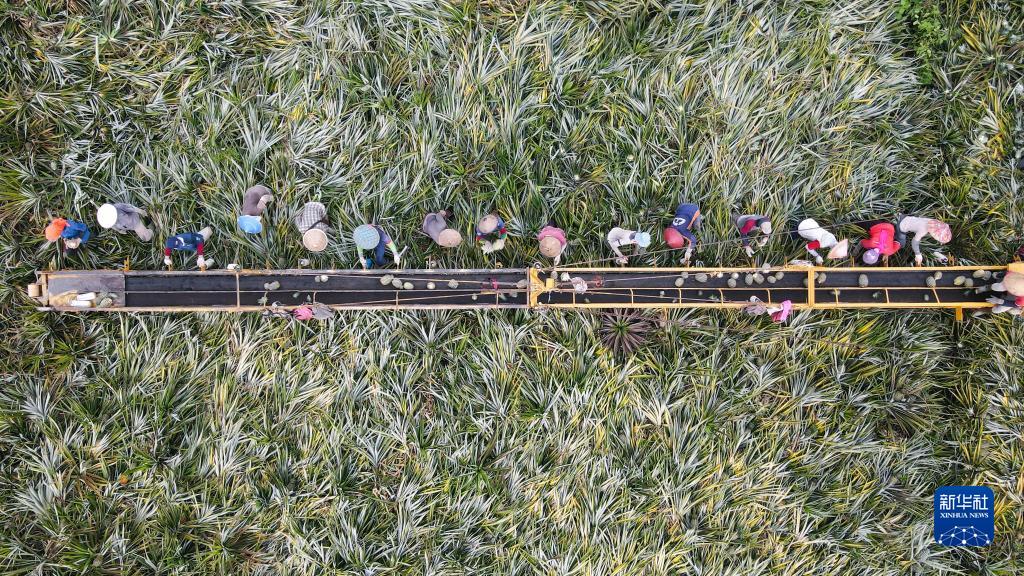 7月5日,在印度尼西亞楠榜省德邦易勿剎縣一處菠蘿種植園,人們在采摘菠蘿(無人機照片)。