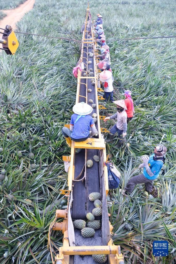 7月5日,在印度尼西亞楠榜省德邦易勿剎縣一處菠蘿種植園,人們在采摘菠蘿。