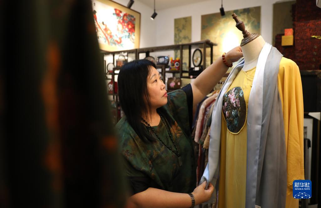 7月5日,王立君在位于遼寧省營口市遼河老街上的工作室里為她設計的帶有滿繡圖案的民族服飾進行搭配。