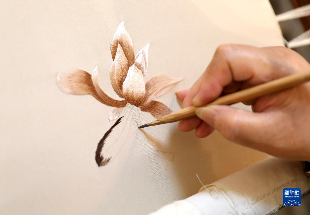 7月5日,王立君在位于遼寧省營口市遼河老街上的工作室里進行滿繡畫稿創作。