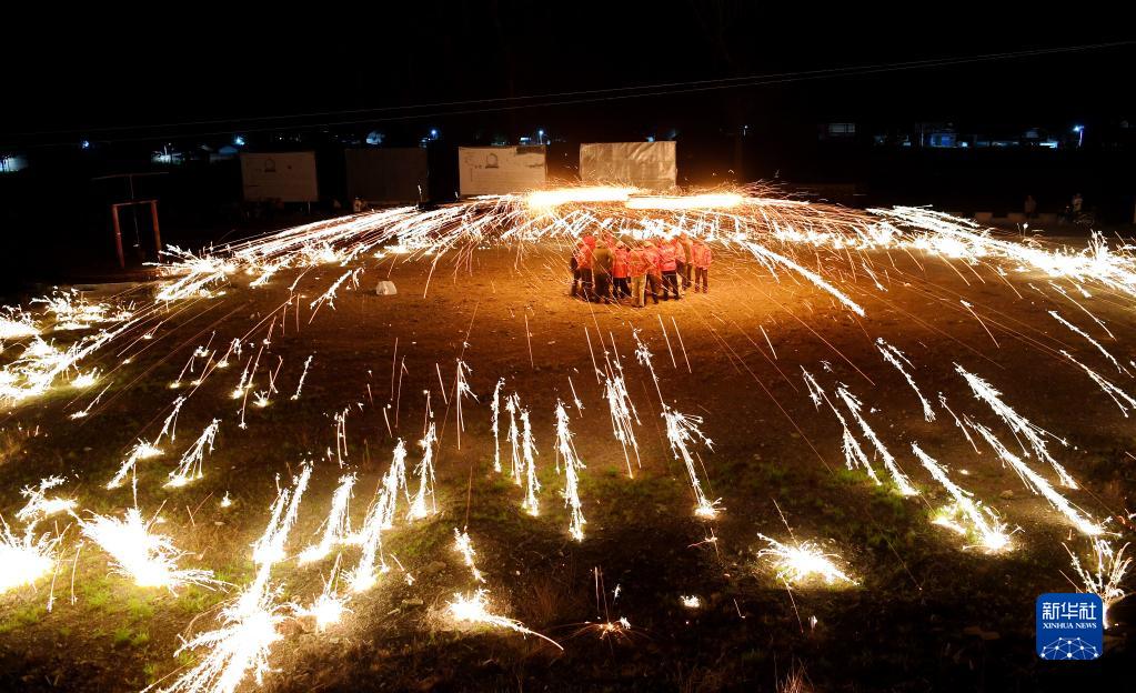 “掄花”是河北省灤平縣一項傳統民俗,已被列入國家級非物質文化遺產名錄。表演時,幾名民間藝人將木炭和碎鐵片一起放到掛在花架上的花筒中燃燒,再合力掄起花架,使花筒內升溫并向四周甩濺鐵花,形成一圈圈光線交織的光環,景象壯觀。